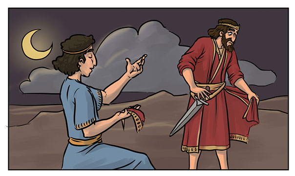 Már kifelé ballagott Saul a barlangból, amikor Dávid utána kiáltott, felmutatva a köpenydarabot.