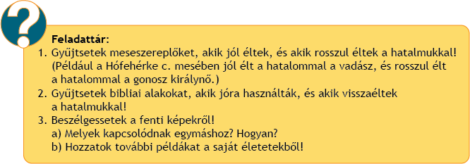 Ha te vagy a nagyobb, az idősebb, az erősebb, az okosabb, a tehetségesebb, a gazdagabb, akkor hatalmad van a kicsi, a fiatal, a gyenge, a kevésbé okos, a szegényebb fölött. Segítheted, támogathatod, vagy bánthatod és kihasználhatod őt. A hatalmat használhatjuk jól és rosszul, élhetünk vele mások és a magunk érdekében.