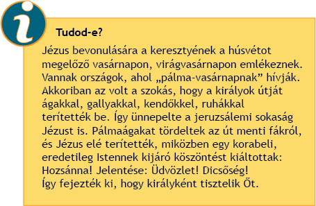 A tanítványok engedelmeskedtek, és nemsokára megjelentek a szamárral. Mire a város kapujához értek, elterjedt a hír, hogy Jézus közeledik. Hatalmas, ujjongó sokaság várta a prófétát, a bölcs tanítót, a csodálatos gyógyítót, akit akkor már mindenki a régen várt Messiás-királyként fogadott.