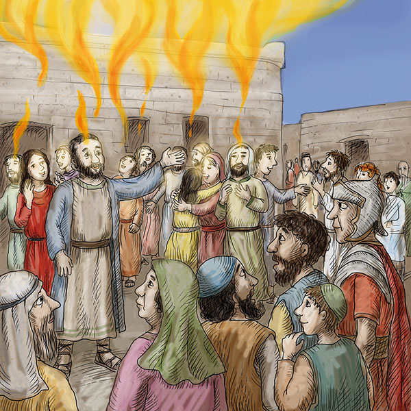 Amikor a Szentlélek lánghoz hasonló formában a tanítványokra szállt, a zúgásra sok ember sereglett össze. Péter kilépve a házból bátran beszélt az összegyűlteknek Jézusról.