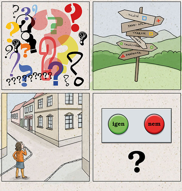 Dönteni általában nem egyszerű. Mi is a döntés? Választás több lehetőség között. Ahhoz, hogy jól döntsünk, először is fel kell ismerni azt, hogy választási lehetőség előtt állunk. Életünk során gyakran kerülünk olyan helyzetbe, amikor döntenünk kell. Ilyenkor jó lenne, ha egy útjelző tábla lenne előttünk. Olyan, aminek az egyik táblájára rá van írva, hogy ez a helyes út. Vagy esetleg egy olyan, aminek minden útmutató táblájára rá van írva, hogy mi fog történni, ha arra indulunk el. Mert egy döntéssel az is együtt jár, hogy a választásunknak következménye van. Néha pedig nem látjuk előre, hogy mi fog történni, ha éppen ezt vagy azt választjuk.