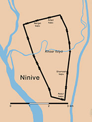 A várost hatalmas kettős fal vette körül, a falak helyenként a 25 méter magasságot is elérték. A fenti rajzon egy városkapu látható, amit a régészek által feltárt romok alapján építettek, elképzelve, milyen lehetett az eredeti. 15 hasonló kapuja volt a városnak. Fő útja, a királyút 30 méter széles volt, mint ma egy négysávos autópálya. A Biblia tanúsága szerint három napig tartott bejárni Ninivét, a külvárosokkal együtt.