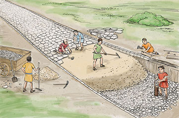 Jézus korában a legjobb útépítők a rómaiak voltak. Ha kellett, a völgyeket feltöltötték, az egyenetlen talajt kiegyenlítették. Mély alapot ástak és több rétegben rakták le a különböző méretű köveket. Az út két oldala lefelé lejtett, hogy elvezesse az esővizet. A tetejét sima kövekkel burkolták. Az útépítés célja a gyors közlekedés biztosítása volt. Ezt leginkább a hadsereg miatt tartották fontosnak. Az uralkodó látogatása különleges esemény volt. Érkezése előtt is igyekeztek az utakat rendbe rakni. Nem fordulhatott elő, hogy a legfontosabb ember úthiba miatt ne tudjon továbbmenni.