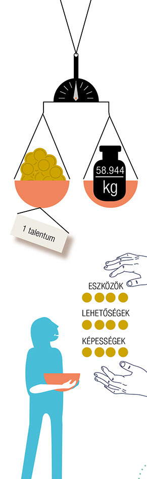 „Mert úgy van ez, mint amikor egy idegenbe készülő ember hívatta szolgáit, és rájuk bízta vagyonát. Az egyiknek adott öt talentumot, a másiknak kettőt, a harmadiknak pedig egyet, kinek-kinek képessége szerint, és elment idegenbe. Az, aki az öt talentumot kapta, azonnal elindult, vállalkozásba fogott vele, és másik ötöt keresett hozzá. Ugyanígy a két talentumos is másik kettőt keresett hozzá. Aki pedig az egyet kapta, elment, gödröt ásott a földbe, és elrejtette ura pénzét. Hosszú idő múlva azután megjött ezeknek a szolgáknak az ura, és számadást tartott velük. Eljött az, aki az öt talentumot kapta, hozott másik öt talentumot, és így szólt: Uram, öt talentumot bíztál rám: nézd, másik öt talentumot kerestem. Ura így szólt hozzá: Jól van, jó és hű szolgám, a kevésen hű voltál, sokat bízok rád ezután, jöjj, és osztozz urad örömében! Eljött az is, aki a két talentumot kapta, és ezt mondta: Uram, két talentumot bíztál rám: nézd, másik két talentumot kerestem. Ura így szólt hozzá: Jól van, jó és hű szolgám, a kevésen hű voltál, sokat bízok rád ezután, jöjj, és osztozz urad örömében! És amikor eljött az, aki az egy talentumot kapta, ezt mondta: Uram, tudtam, hogy könyörtelen ember vagy, aki ott is aratsz, ahol nem vetettél, és onnan is gyűjtesz, ahová nem szórtál. Félelmemben elmentem tehát, és elástam a talentumodat a földbe: nézd, itt van az, ami a tied. Ura így válaszolt neki: Te gonosz és rest szolga, tudtad, hogy ott is aratok, ahol nem vetettem, és onnan is gyűjtök, ahova nem szórtam? Ezért el kellett volna vinned a pénzemet a pénzváltókhoz, és amikor megjöttem, kamatostul kaptam volna vissza azt, ami az enyém. Vegyétek el tőle a talentumot, és adjátok annak, akinek tíz talentuma van!” (Mt 25,14–28)