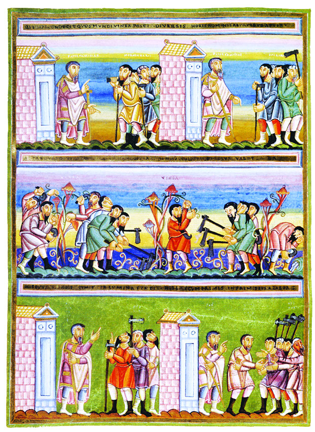 „Hasonló a mennyek országa ahhoz a gazdához, aki korán reggel kiment, hogy munkásokat fogadjon a szőlőjébe. Miután megegyezett a munkásokkal napi egy dénárban, elküldte őket a szőlőjébe. Amikor kiment kilenc óra tájban, látta, hogy mások is állnak a piacon tétlenül, és ezt mondta nekik: Menjetek el ti is a szőlőmbe, és ami jogos, megadom nektek. Azok pedig elmentek. Ismét kiment tizenkét óra körül és délután három óra tájban, és ugyanígy tett. Amikor pedig délután öt óra tájban is kiment, talált újabb embereket, akik ott álldogáltak, és megkérdezte tőlük: Miért álltok itt egész nap tétlenül? Azok pedig így válaszoltak: Mert senki sem fogadott fel bennünket. Erre ezt mondta nekik: Menjetek el ti is a szőlőmbe! Miután pedig beesteledett, ezt mondta a szőlő gazdája a munkások vezetőjének: Hívd ide a munkásokat, és fizesd ki a bérüket, az utolsókon kezdve az elsőkig. Ekkor jöttek azok, akik öt óra tájban álltak munkába, és kaptak egy-egy dénárt. Amikor az elsők jöttek, azt gondolták, hogy többet kapnak, de egy-egy dénárt kaptak ők is. Amikor átvették, zúgolódni kezdtek a gazda ellen, és ezt mondták: