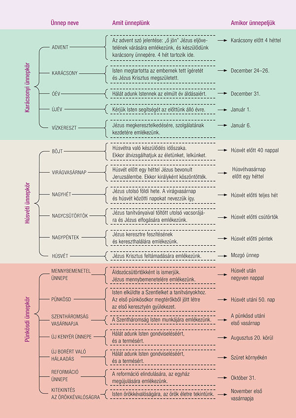 Az egyházi évben is találkozhatunk ünnepekkel. Az egyházi év másképp tagozódik, mint a naptári év. Nem január 1-től december 31-ig tart, hanem adventtől a következő adventig. Ezek olyan alkalmak, amikor Isten különleges tetteire emlékezünk. A református egyházi év három nagy ünnepkörre osztható. Ezek a következők:
