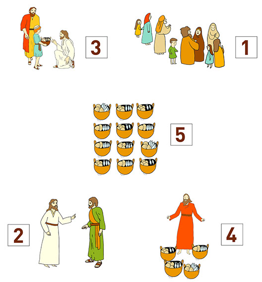 Egy kisfiúnak volt öt kenyere és két hala. Jószívűen felajánlotta azokat. Jézus imádságára ebből a kevésből is sok lett.