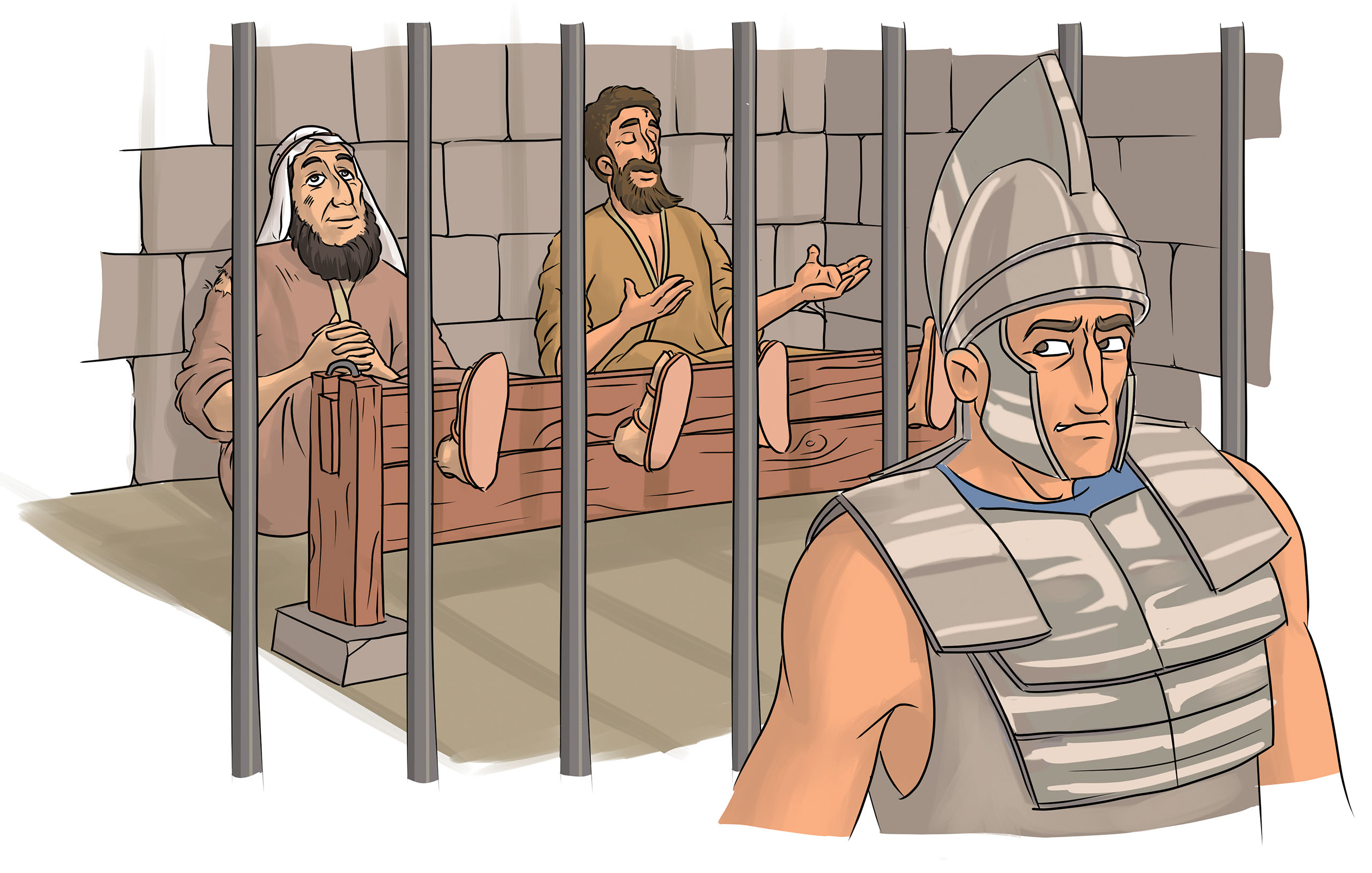 De nem mindenki örült a városban a messziről jött idegeneknek. Pált és Szilászt hamis vádak alapján börtönbe vetették. Kezüket és lábukat megbilincselve egy szűk cellába zárták őket, az ajtó elé pedig egy állig felfegyverzett őrt állítottak. A két apostol ekkor sem ijedt meg. Zsoltárokat kezdtek énekelni, azzal bátorították egymást. Nem is késett soká Isten szabadítása. Éjjel rettenetes földrengés rázta meg a várost. A börtön falai megrepedtek, az ajtók kipattantak, a fáklyák kialudtak. Az ijedt börtönőr félelmében azt se tudta, hova kapjon a hirtelen támadt sötétségben. Biztos volt abban, hogy a rabok megszöknek, és akkor neki vége, halállal büntetik! Végső kétségbeesésében már az öngyilkosságra gondolt, amikor a sötétben megszólalt Pál: