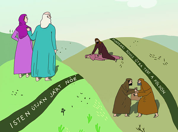 Az emberek közül ekkor sokan gonosz dolgokat tettek. Nem törődtek Istennel, és bántották egymást. Nóé azonban igaz ember volt.